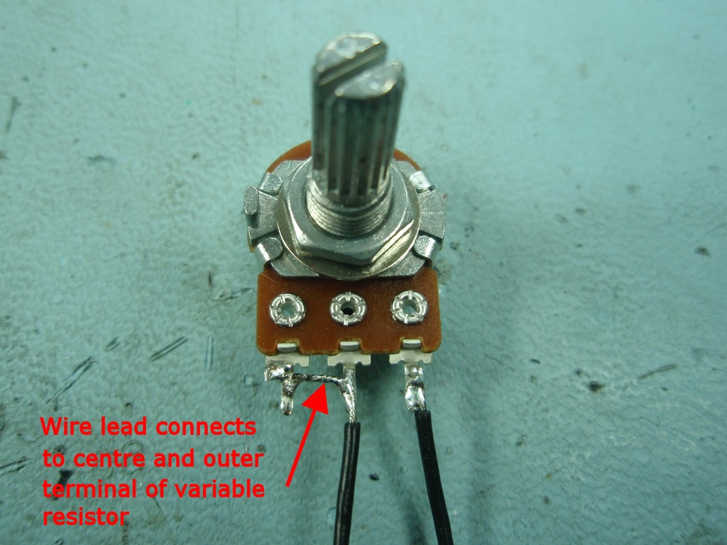 10K variable resistor. Note how one wire connects to both the