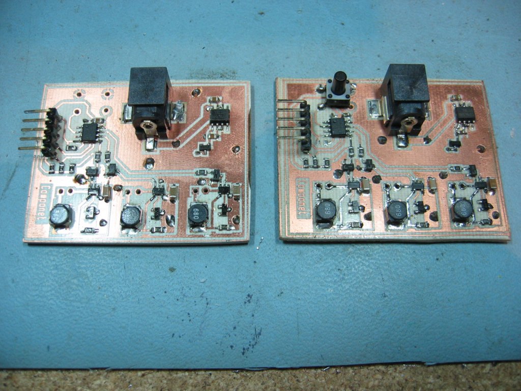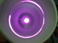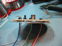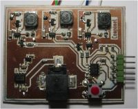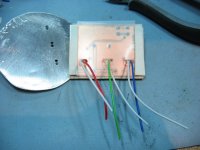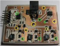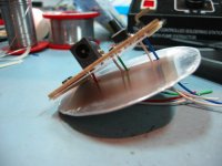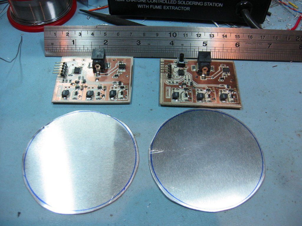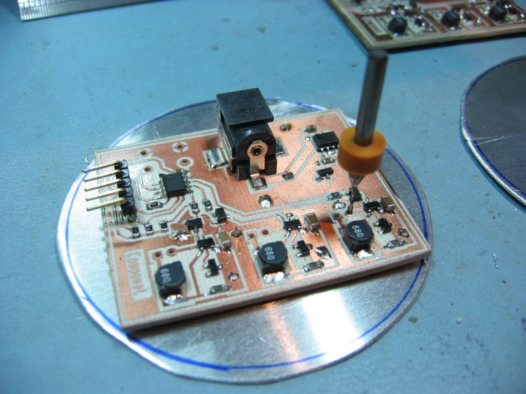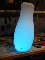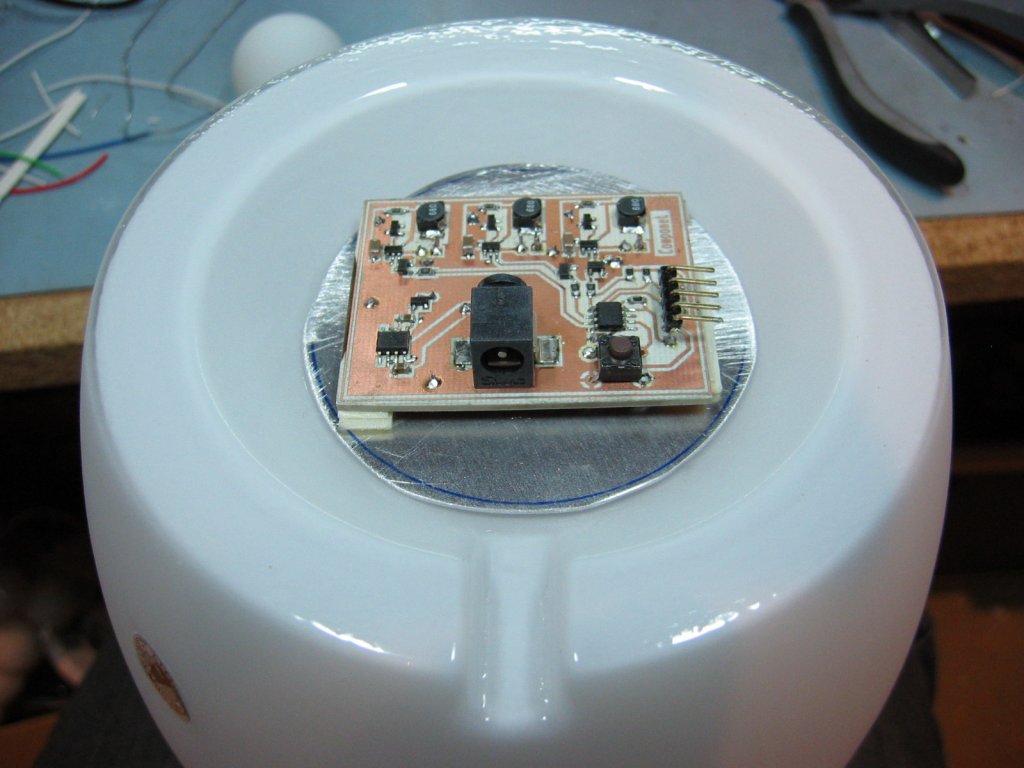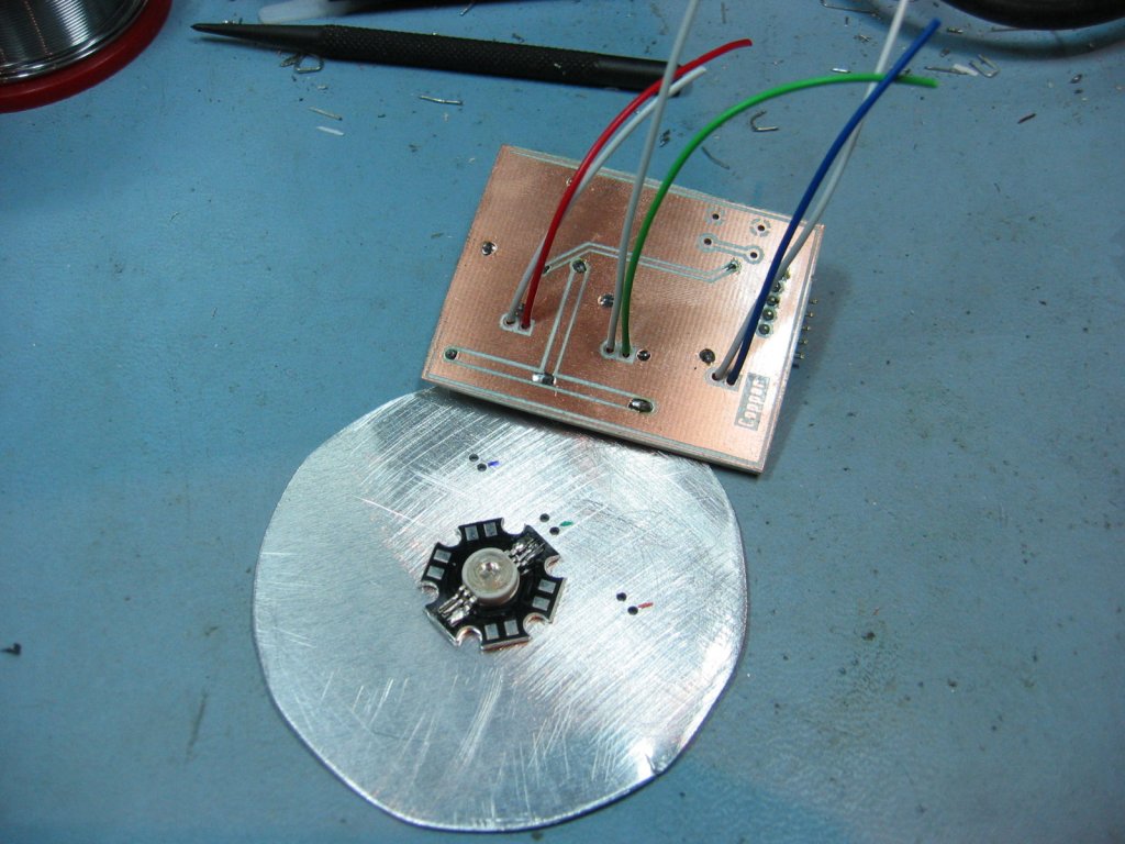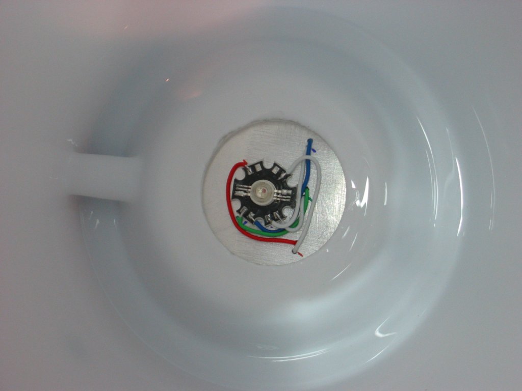 The pad size for the three inductors is SM2512. There are such a variety of inductors that could be used here with so many different footprints. I've left some clear area around the pads to facilitate the use of various inductors but you should make sure that the ones you do use aren't going to touch other areas of copper. This may require some creative positioning of the inductors. The RGB LEDs connect with the anode to the inductor and the cathode to the track that disappears under the ZXLD1350's. This should be apparent from the schematic but I'll mention it anyway. The 5 pin ICSP header needs soldering on the component side of the PCB and the middle pin also needs soldering on the copper side. It can be fitted to either side of the board depending on how you are going to mount the PCB, but you must make sure you solder it so it connects all the PCB tracks. This probably makes more sense if you look at the PCB. The push button switch can be mounted on either side of the PCB to suit your specific application. The surface mount DC power socket is a Switchcraft RASM722 2.1mm SMT Power Socket. (Rapid Electronics P/N 20-0896) 0.33 ohm SMD resistors and ZXLD1350 can be sourced from Farnell The 3 Watt RGB LED can be difficult to source, Rapid Electronics did have one, Farnell only do the Lamina Atlas which isn't suitable for this project. The only other source seems to be buying from sellers in Hong Kong or China through E-Bay. I've done this and even with postage it can be cheaper than UK suppliers, although it can take 10-14 days to arrive. I've used this company http://stores.ebay.co.uk/Sure-Electronics The LED is fixed to the aluminium disc using Adhesive Thermal Pads. In the UK you can get this from Rapid Electronics and Farnell.In the photographs below, the PCB is fixed to the aluminium disc using thick (foam backed) double sided tape. The tape is doubled up to give some clearance between the disc and underside of the PCB and a thin sheet of plastic (from take-away food container) is used to provide insulation between the two. The depth of the recess in the base of the lamp requires that you make the whole assembly as shallow as possible, otherwise the body of the DC power connecter will be below the bottom of the lamp base. Keep this in mind when assembling it. A ping pong ball, cut in two makes a good light diffuser. I've also used opaque tops from aerosol tins to good effect. Although this specific application makes use of a single package RGB LED, it is equally suited to driving separate red, green and blue LEDs. It can also drive 3 pairs of series connected LEDs. However, it cannot be used with RGB LEDs that have a common anode or cathode. Worth checking out are the Lamina Atlas RGB LEDs which