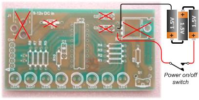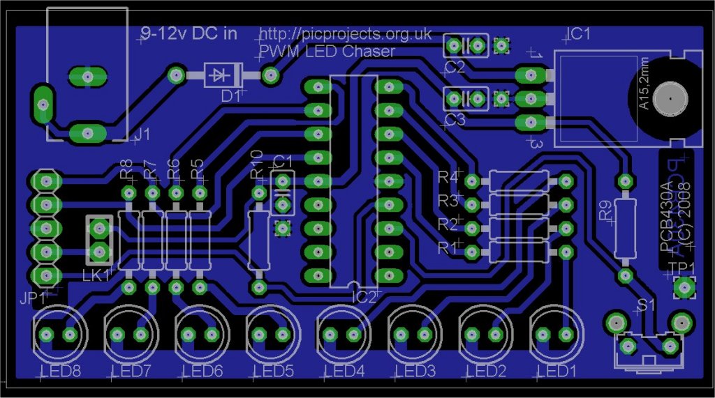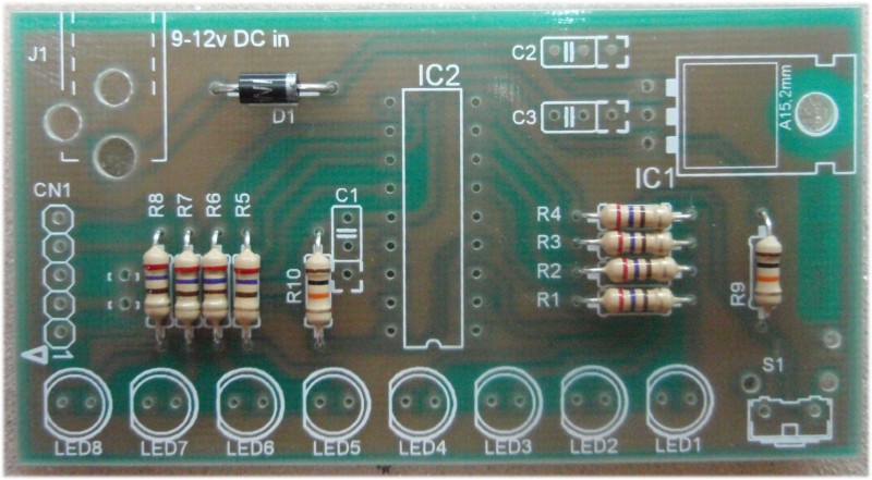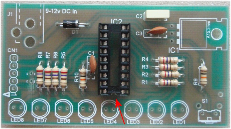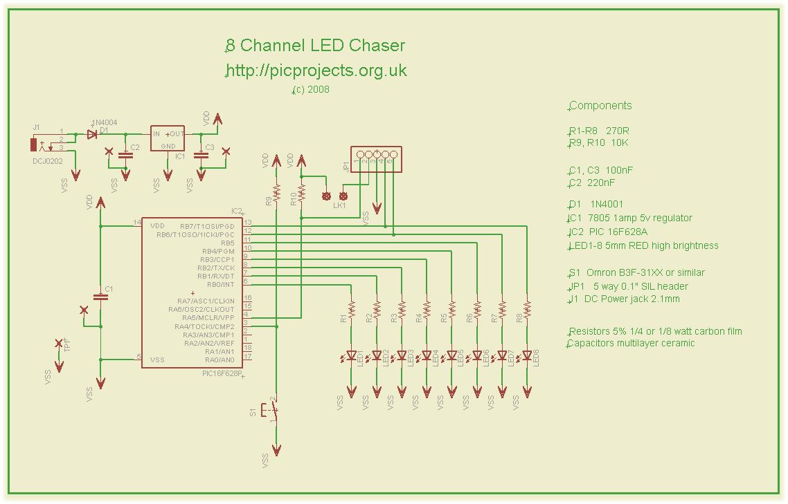 the PIC 16F628A microcontroller, IC2. The program that runs on this chip controls the LEDs