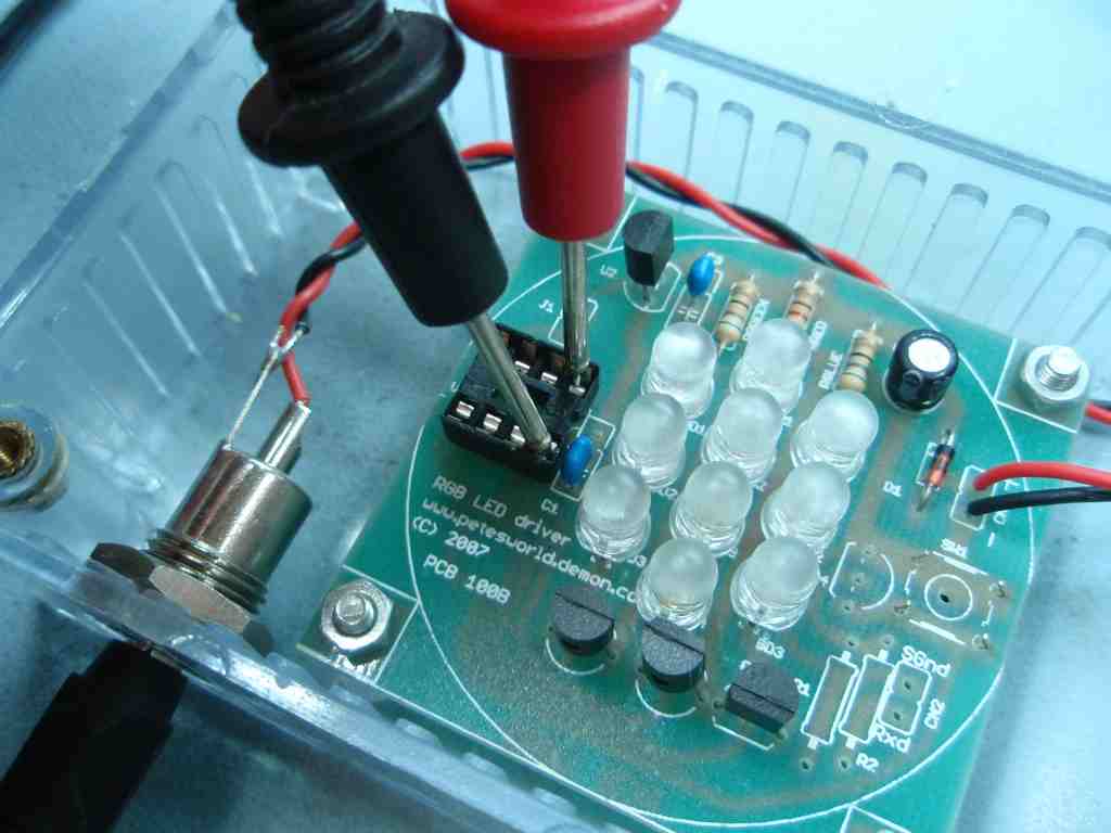 pins 1 and 8 at the IC socket. Pin1 should be +5 Volts