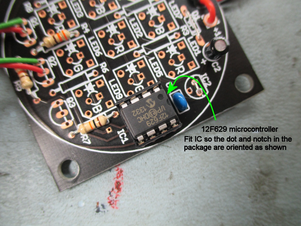 IC2. Use the excess lead cut from the resistors for