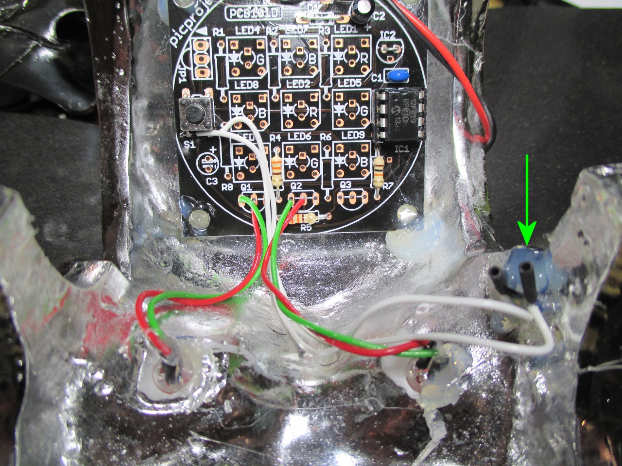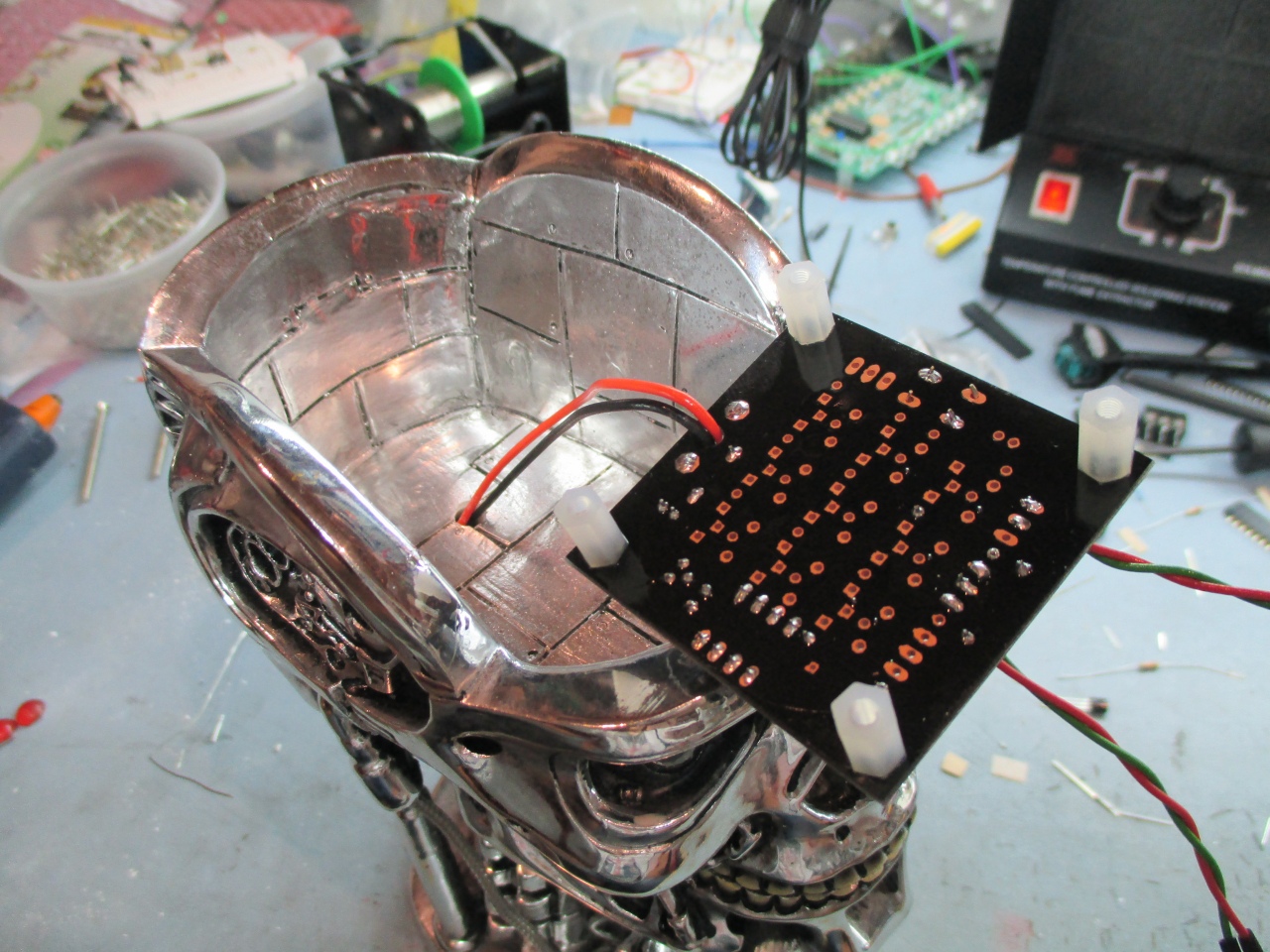 PCB and hot-melt glued them to the inside of the skull.